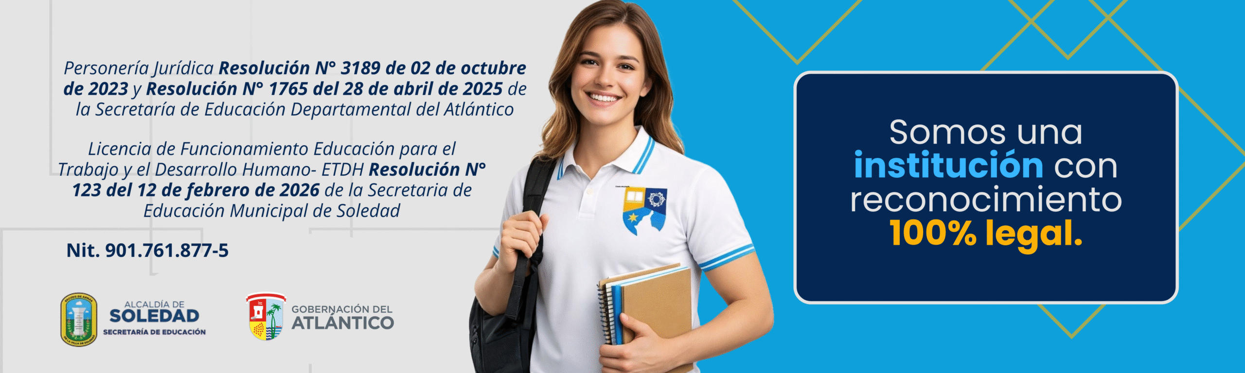 Estamos constituidos legalmente como una entidad privada sin ánimo de lucro, con Personería Jurídica reconocida mediante Resolución No. 3189 del 02 de octubre de 2023 y reformada mediante Resolución No. 1765 del 28 de abril de 2025, expedidas por la Secretaría de Educación Departamental del Atlántico, identificada con el NIT 901.761.877-5.